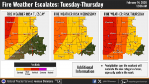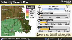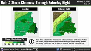 We’re waking up to light rain across the area, and that’s going to set the tone for much of the day. According to the National Weather Service Norman, we’ll stay breezy with periods of rain through the afternoon. Highs are expected to climb into the upper 60s, so it’ll be mild for mid-February.