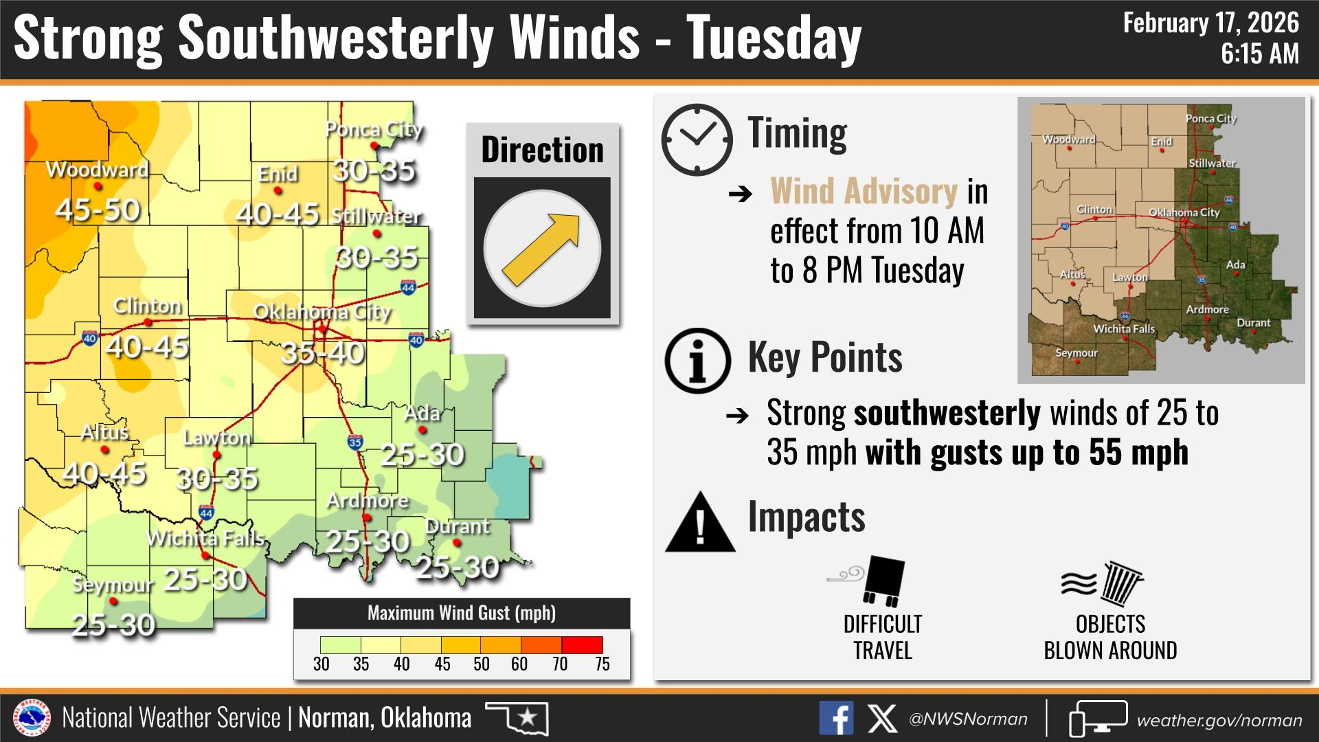 Wind Advisory in effect from February 17, 10:00 AM CST until February 17, 08:00 PM CST
